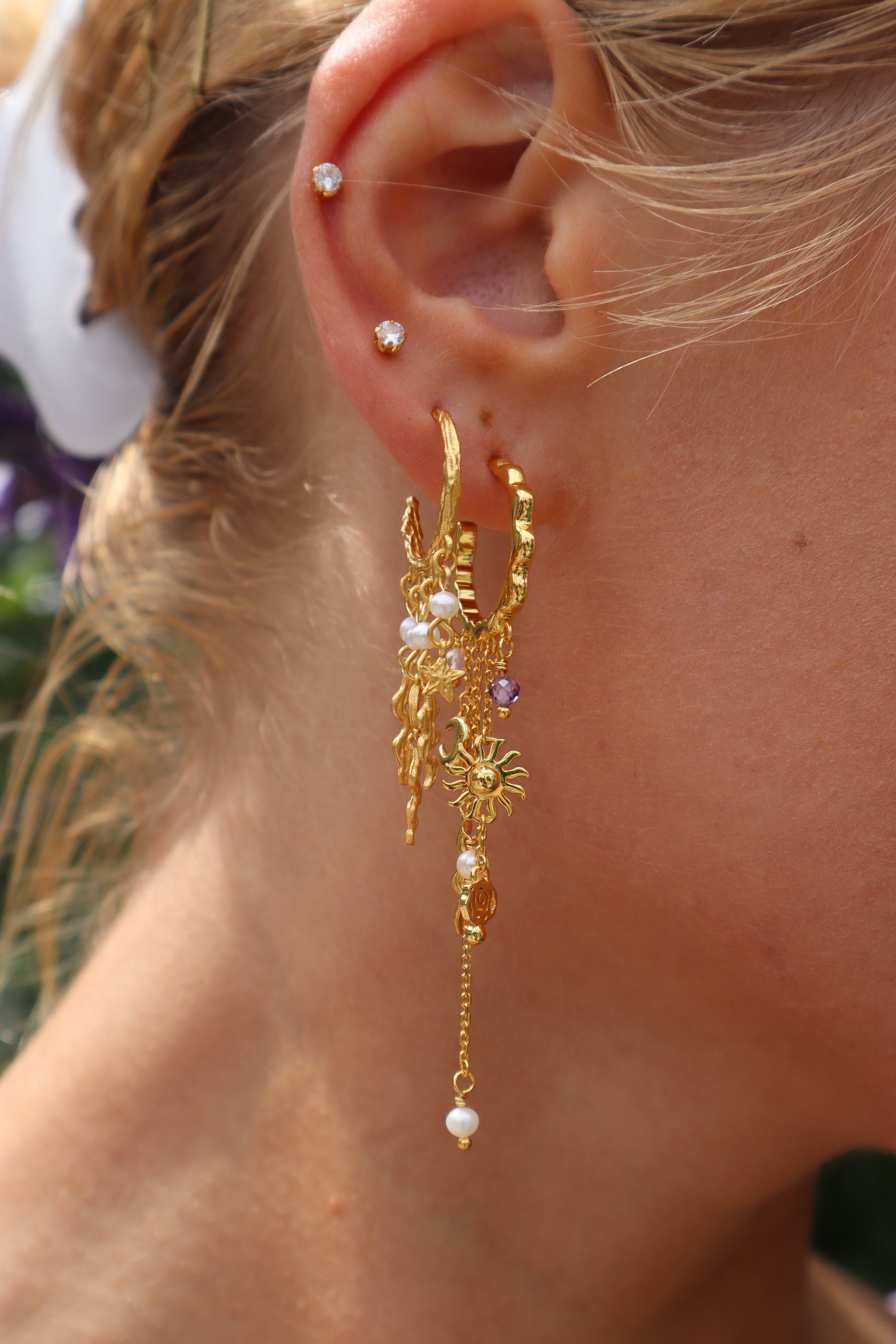 Med en längd på 7,3 cm pryder de dina öron med elegans och rörelse. Örhängena är tillverkade av äkta silver, pläterade med 24 karats guld, och dekorerade med sötvattenspärlor för en unik och sofistikerad look.